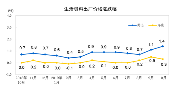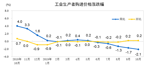 2019年10月份,全國工業(yè)生產(chǎn)者出廠價格同比下降1.6%,環(huán)比上漲0.1%;工業(yè)生產(chǎn)者購進價格同比下降2.1%,環(huán)比上漲0.2%。1—10月平均,工業(yè)生產(chǎn)者出廠價格比去年同期下降0.2%,工業(yè)生產(chǎn)者購進價格下降0.5%。