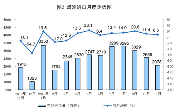 11月份,煤炭進口2078萬噸,同比增長8.5%,增速比上月回落2.9個百分點。1—11月份,煤炭進口2.99億噸,同比增長10.2%。