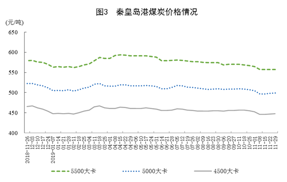 煤炭價格小幅下跌。11月29日,秦皇島港5500大卡、5000大卡和4500大卡煤炭綜合交易價格分別為每噸557元、499元和448元,比11月1日分別回落8元、6元和5元。