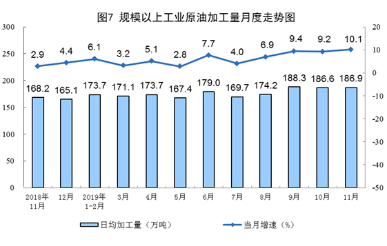 11月份,加工原油5608萬噸,同比增長10.1%,增速比上月加快0.9個百分點;日均加工186.9萬噸,環(huán)比增加0.3萬噸。1—11月份,加工原油59318萬噸,同比增長6.7%。