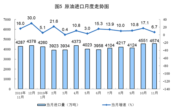11月份,原油進口4574萬噸,比上月增加23萬噸,同比增長6.7%,增速比上月回落10.4個百分點。1—11月份,原油進口46188萬噸,同比增長10.5%。