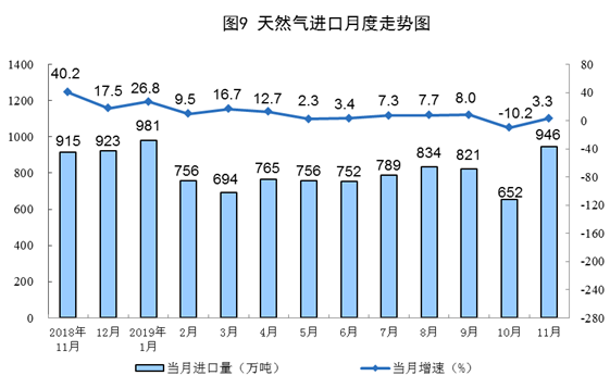 11月份,天然氣進口946萬噸,比上月增加294萬噸,同比增長3.3%,而上月為下降10.2%。1—11月份,天然氣進口8711萬噸,同比增長7.4%。