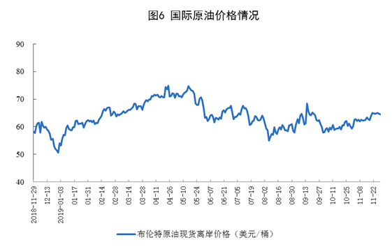 11月份,國際原油價格有所回升。11月29日,布倫特原油現(xiàn)貨離岸價格為64.5美元/桶,比10月31日提高5.2美元。