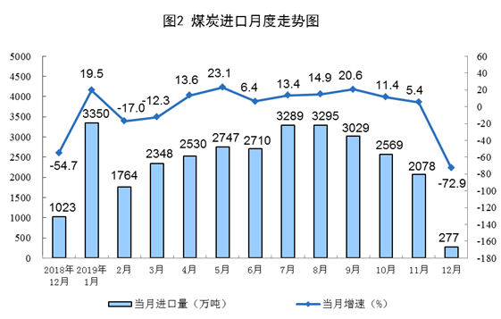 12月份,煤炭進(jìn)口量同比下降72.9%。2019年進(jìn)口煤炭3.0億噸,比上年增長(zhǎng)6.3%。