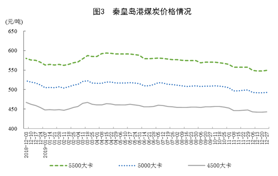 煤炭?jī)r(jià)格回落。12月27日,秦皇島港5500大卡、5000大卡和4500大卡煤炭綜合交易價(jià)格分別為每噸549元、493元和443元,比11月29日分別回落8元、6元和5元。