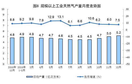 12月份,天然氣產(chǎn)量160億立方米,同比增長(zhǎng)7.5%,增速比上月回落0.5個(gè)百分點(diǎn);日產(chǎn)5.2億立方米,環(huán)比增加0.2億立方米。2019年,天然氣產(chǎn)量1736億立方米,比上年增長(zhǎng)9.8%。