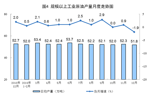 12月份,原油產(chǎn)量1606萬(wàn)噸,同比下降1.9%,上月為增長(zhǎng)0.9%;日均產(chǎn)量51.8萬(wàn)噸,環(huán)比減少0.5萬(wàn)噸。2019年國(guó)內(nèi)主要油田穩(wěn)產(chǎn)增產(chǎn)態(tài)勢(shì)良好,原油產(chǎn)量1.9億噸,比上年增長(zhǎng)0.8%,扭轉(zhuǎn)了2016以來(lái)連續(xù)下滑的態(tài)勢(shì)。