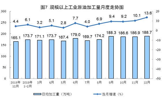 12月份,原油加工量5851萬(wàn)噸,同比增長(zhǎng)13.6%,增速比上月加快3.5個(gè)百分點(diǎn);日均加工188.7萬(wàn)噸,環(huán)比增加1.8萬(wàn)噸。2019年,受新增煉油產(chǎn)能持續(xù)釋放影響,原油加工量繼續(xù)較快增長(zhǎng),加工原油6.5億噸,比上年增長(zhǎng)7.6%。