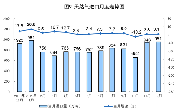 12月份,進(jìn)口天然氣951萬(wàn)噸,同比增長(zhǎng)3.1%。2019年進(jìn)口天然氣9656萬(wàn)噸,比上年增長(zhǎng)6.9%。