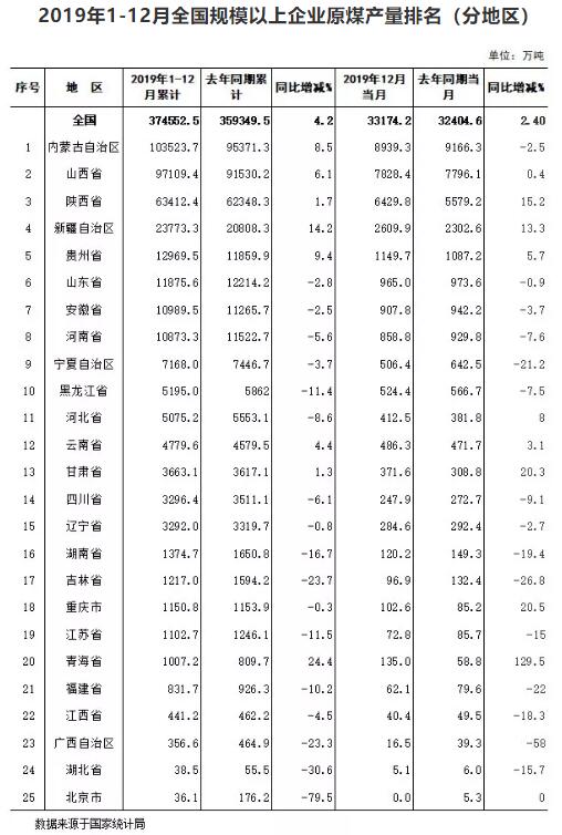 根據(jù)國家統(tǒng)計(jì)局最新公布數(shù)據(jù)顯示,2019年全國原煤產(chǎn)量(規(guī)模以上口徑,下同)37.5億噸,比上年增長4.2%。