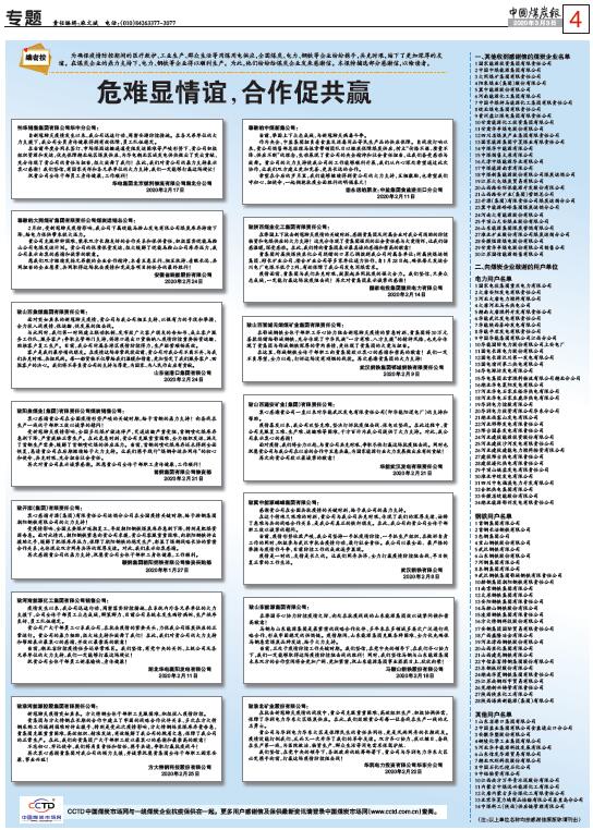 編者按:為確保疫情防控期間的醫(yī)療救護(hù)、工業(yè)生產(chǎn)、群眾生活等用煤用電供應(yīng),全國(guó)煤炭、電力、鋼鐵等企業(yè)紛紛攜手,共克時(shí)艱,結(jié)下了更加深厚的友誼。在煤炭企業(yè)的鼎力支持下,電力、鋼鐵等企業(yè)得以順利生產(chǎn)。為此,他們紛紛給煤炭企業(yè)發(fā)來感謝信。本報(bào)特摘選部分感謝信,以饗讀者。?接受感謝信煤炭企業(yè)名單 1 國(guó)家能源投資集團(tuán)有限責(zé)任公司2 中國(guó)中煤能源集團(tuán)有限公司3 大同煤…