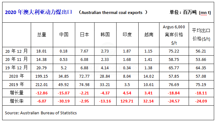 據(jù)阿格斯(Argus)援引澳大利亞聯(lián)邦統(tǒng)計局(Australian Bureau of Statistics —ABS)發(fā)布的數(shù)據(jù)顯示,2020年12月,澳大利亞動力煤出口1801萬噸,比2019年12月的2079萬噸下降13.4%,比11月份的1438萬噸增長25.2%。