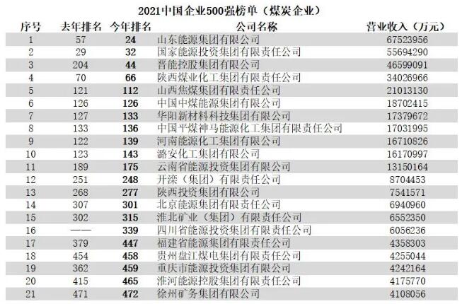 今年共有21家煤炭企業(yè)上榜。其中,山東能源集團(tuán)有限公司、國家能源投資集團(tuán)有限責(zé)任公司、晉能控股集團(tuán)有限公司、陜西煤業(yè)化工集團(tuán)有限責(zé)任公司入圍榜單前100名。四川省能源投資集團(tuán)有限責(zé)任公司為新上榜企業(yè)。有8家企業(yè)排名較去年有所提升,11家企業(yè)排名下降,1家企業(yè)排名持平。