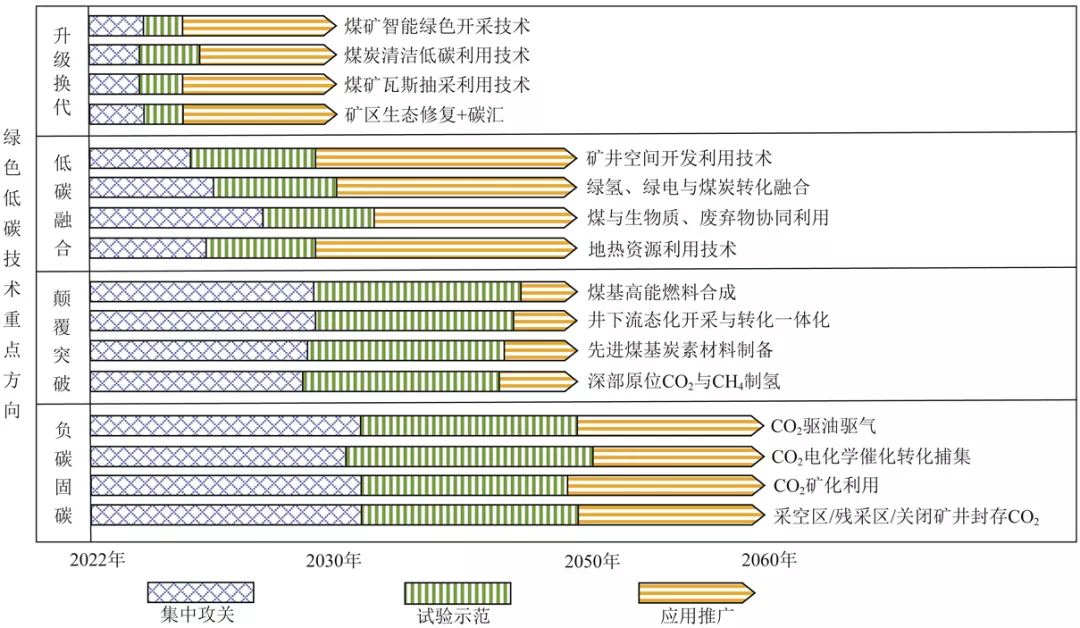 創(chuàng)新綠色低碳技術(shù)不僅是當(dāng)前煤炭行業(yè)轉(zhuǎn)型發(fā)展的需要,也是國際競爭的熱點(diǎn)。結(jié)合短期與中長期目標(biāo),統(tǒng)籌穩(wěn)增長與調(diào)結(jié)構(gòu),圍繞升級換代、低碳融合、顛覆突破、負(fù)碳固碳四大技術(shù)類型,提出煤炭未來的綠色低碳科技創(chuàng)新重點(diǎn)方向。根據(jù)煤炭行業(yè)綠色低碳技術(shù)發(fā)展現(xiàn)狀與態(tài)勢,現(xiàn)有低碳升級技術(shù)在2025年左右可實(shí)現(xiàn)規(guī)模化應(yīng)用推廣。2025年前,主要進(jìn)行低碳融合技術(shù)與負(fù)碳技術(shù)的攻關(guān);2025—2030年,開展技術(shù)試驗(yàn)與示范,并根據(jù)技術(shù)成熟度和減碳需求適時(shí)規(guī)模化應(yīng)用推廣;2030年前,主要目標(biāo)是完成重大顛覆突破技術(shù)的集中攻關(guān)和試驗(yàn)示范;2030年后,取得突破的技術(shù)進(jìn)行規(guī)模應(yīng)用,實(shí)現(xiàn)大規(guī)模減碳,為2060年實(shí)現(xiàn)碳中和奠定基礎(chǔ)。