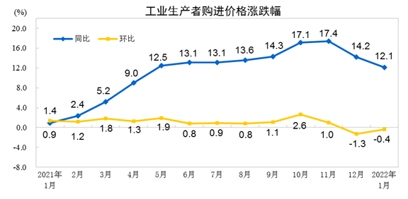 2022年1月份,全國(guó)工業(yè)生產(chǎn)者出廠價(jià)格同比上漲9.1%,環(huán)比下降0.2%;工業(yè)生產(chǎn)者購(gòu)進(jìn)價(jià)格同比上漲12.1%,環(huán)比下降0.4%。